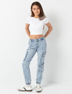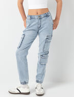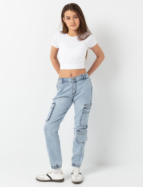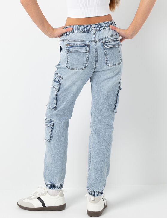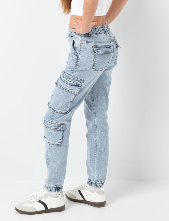 These cargo jeans bring a trendy, urban touch to any outfit. With multiple utility pockets and elastic cuffs, they offer a perfect balance of comfort and style. The faded denim gives them a cool, effortless look, ideal for everyday adventures.