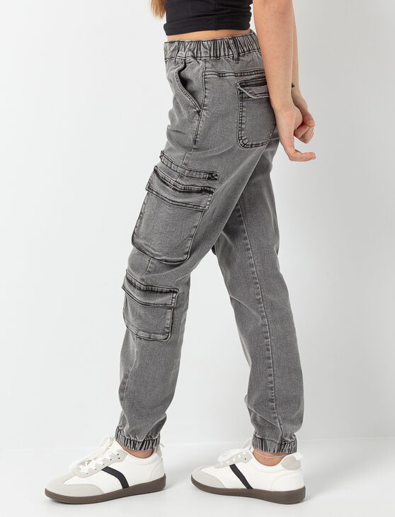 These cargo jeans bring a trendy, urban touch to any outfit. With multiple utility pockets and elastic cuffs, they offer a perfect balance of comfort and style. The faded denim gives them a cool, effortless look, ideal for everyday adventures.