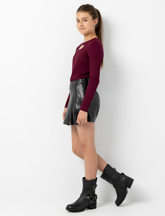 Perfect for making a bold statement, this faux leather skort is a must-have for any teen. The look of a skirt with the comfort of shorts, a winning combo for moving with confidence.