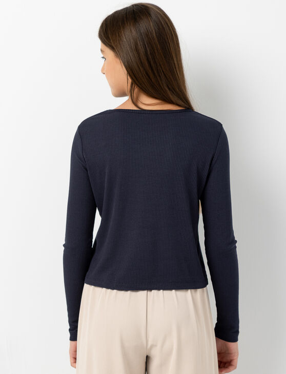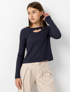 This fitted ribbed knit top features a subtle neckline cut-out that adds a stylish twist to any outfit. A versatile piece that keeps up with her everyday style.