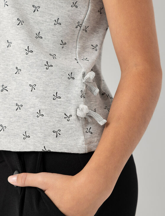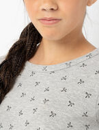 A feminine t-shirt adorned with a delicate pattern and pretty side bows, blending charm and originality.