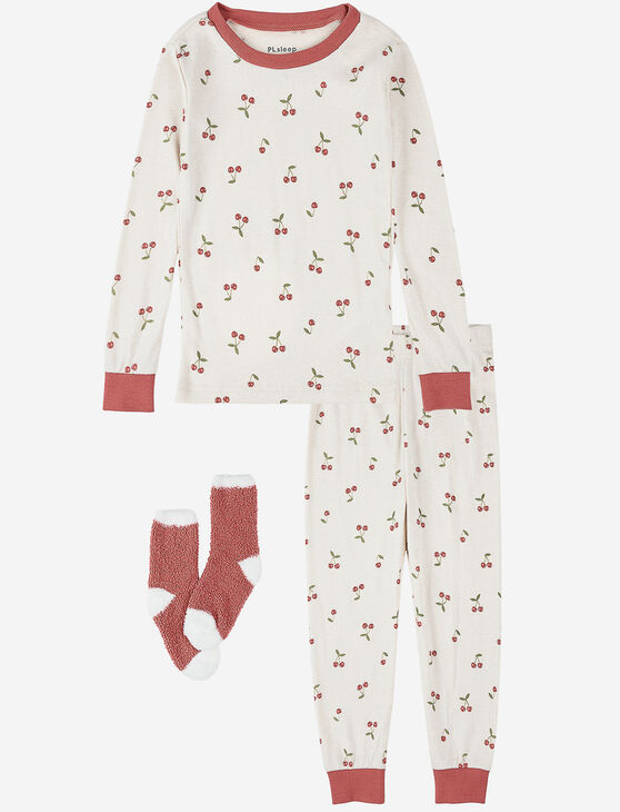 Give your child cozy nights with this 2-piece pajama set featuring a cherry print, ribbed cuffs and ankles for a snug fit, and soft socks for extra comfort.