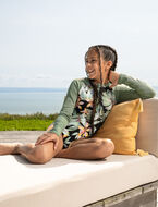 Perfect for sunny days, this 1-piece offers UPF 50 protection, a handy half-zip and a vibrant tropical print. Raglan sleeves ensure comfort and easy movement through every splash and play.