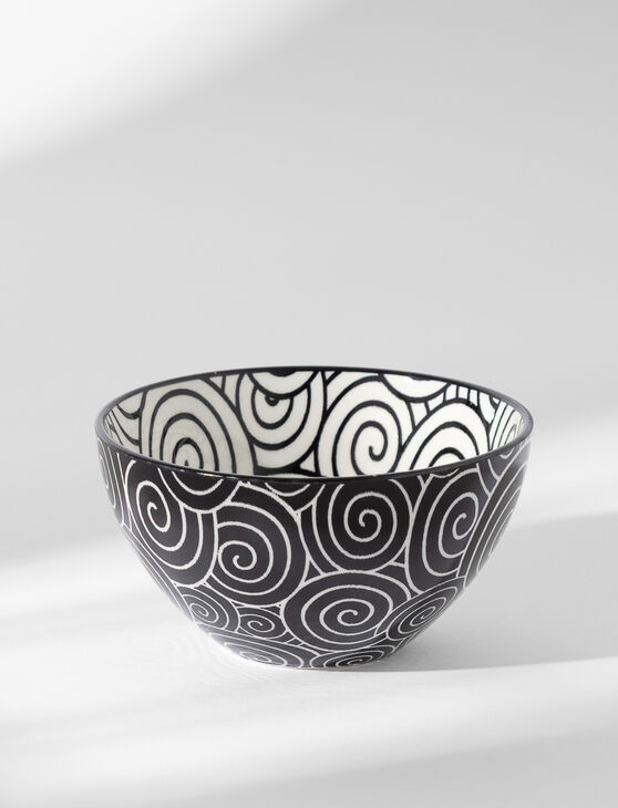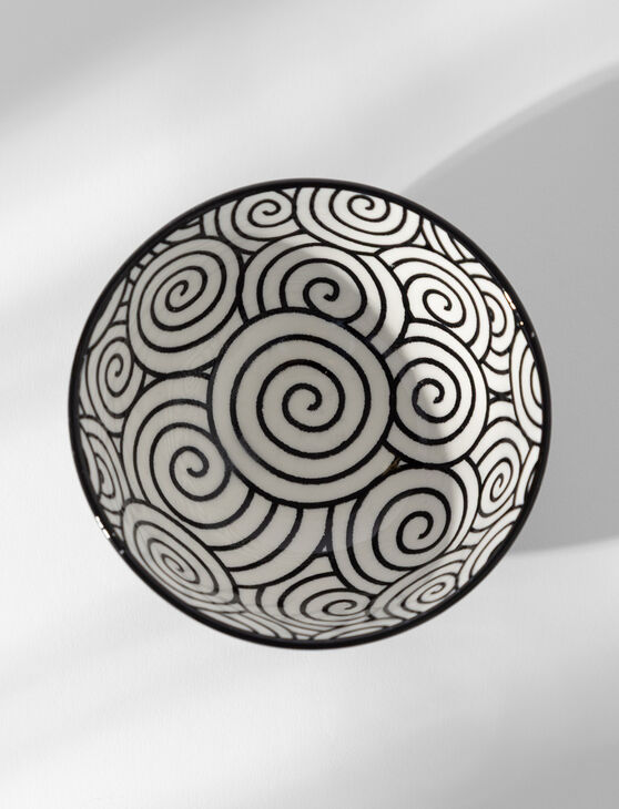 Add style to your table with this round stoneware bowl, perfect for dips, condiments, or sauces. Black and white pattern, microwave and dishwasher safe. 10 cm / 200 ml (4" / 7 oz)."
