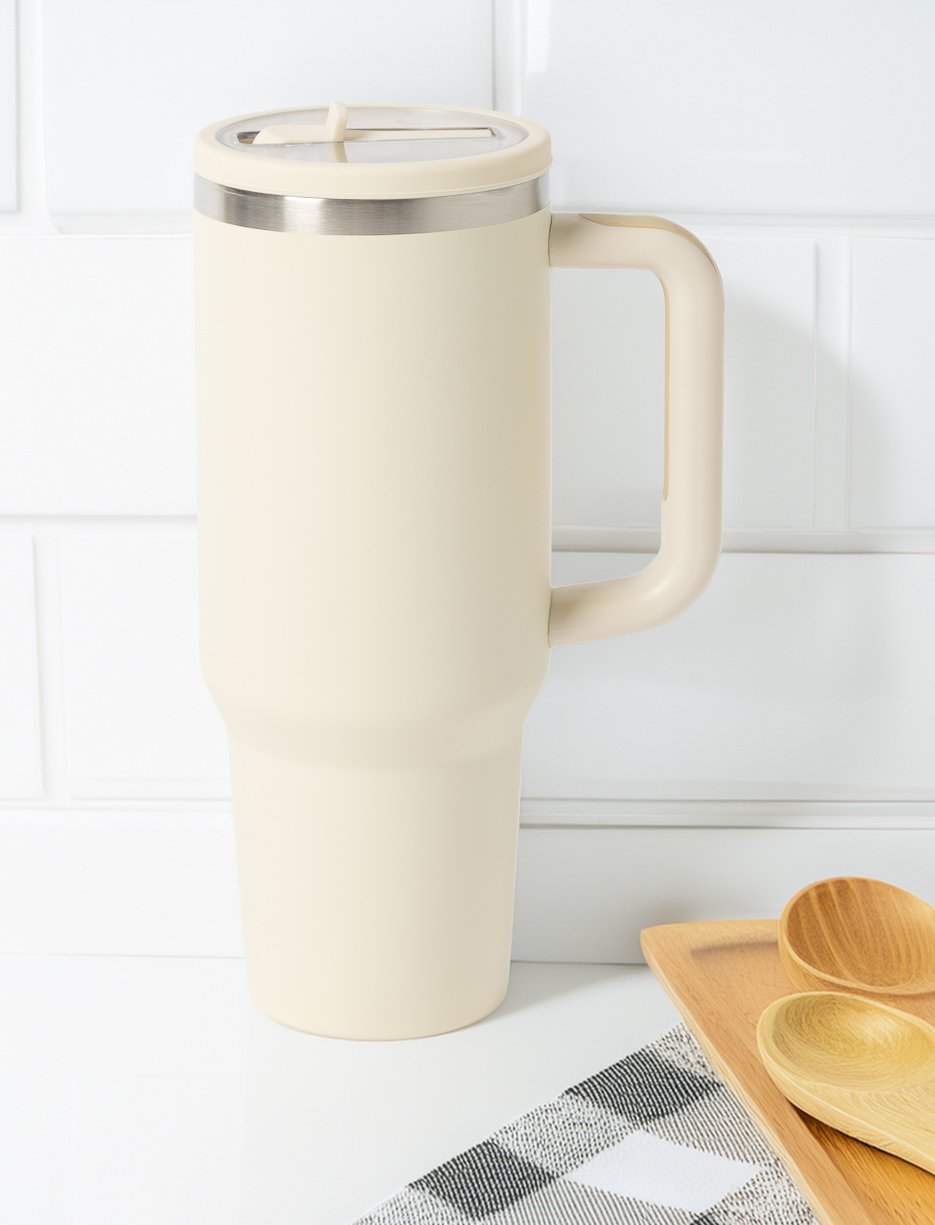 Carry your drinks in style with this stainless steel travel mug. Featuring a handle, lid, and straw, it offers a generous 40 oz capacity and measures 14.3 x 9 x 25.5 cm, perfect for taking anywhere.