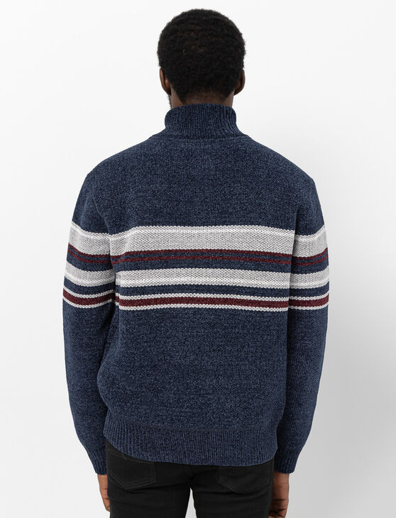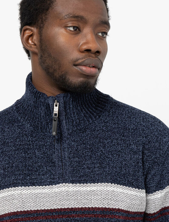 A striped knit half-zip sweater that blends warmth and casual style, perfect for your cooler days.