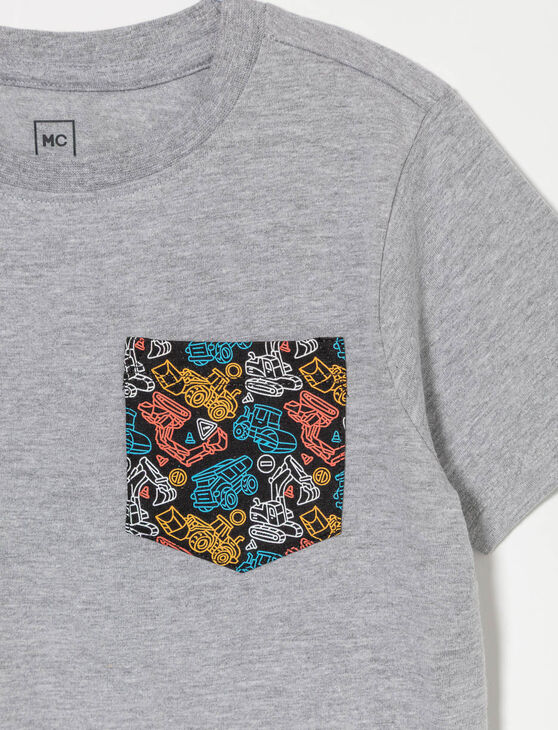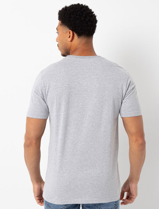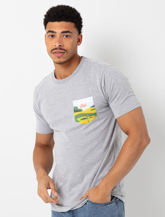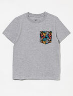 A staple with a twist! This grey t-shirt keeps it simple while the printed pocket adds a subtle pop to your laid-back style.