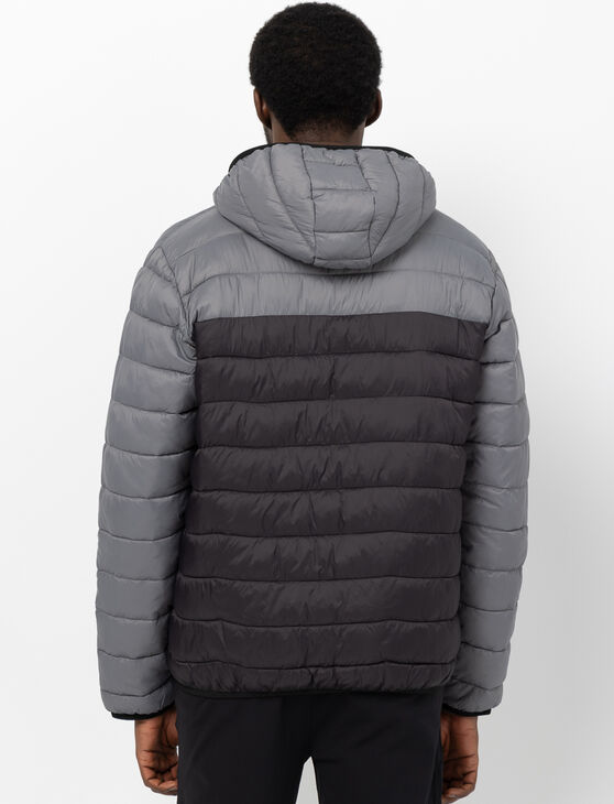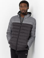 Stay warm in style with this hooded puffer jacket. Its modern two-tone design and practical details make it a seasonal essential.