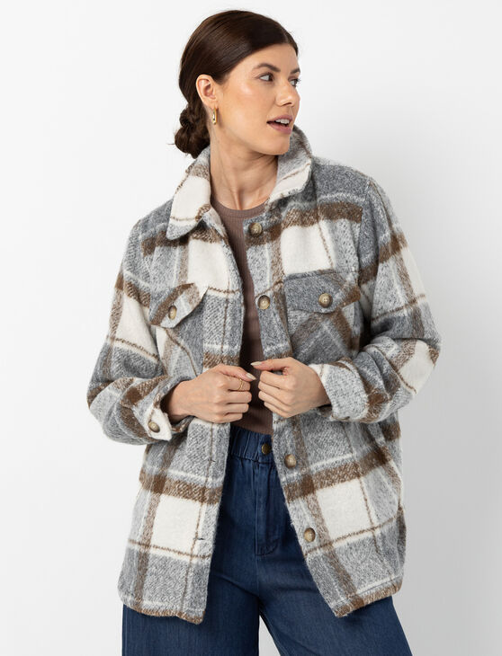 Add warmth and style to your outfits with this plaid shacket, perfect for mid-season wear. Its relaxed fit and vibrant colors make it a trendy yet comfortable piece.