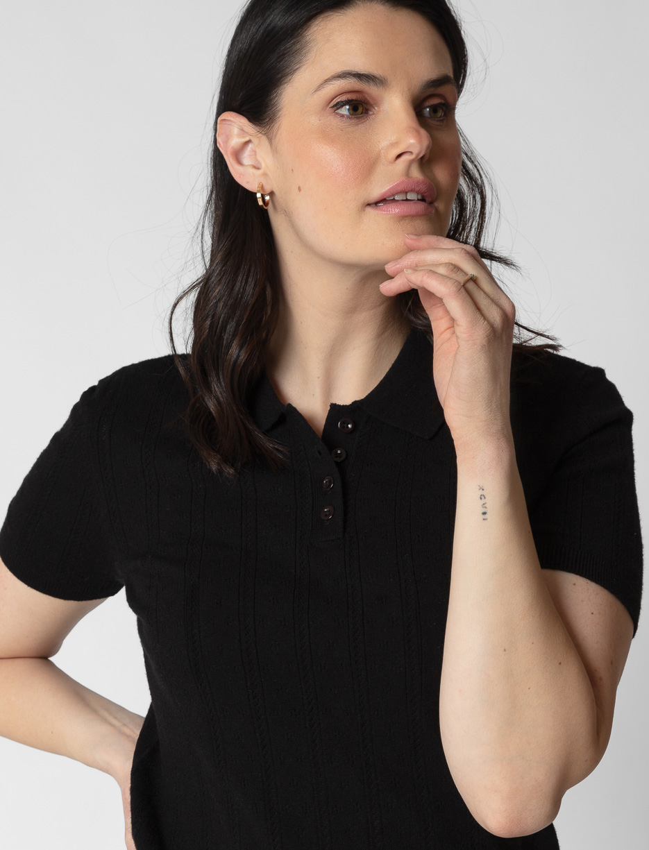 This pointelle-knit polo reimagines a classic with a touch of femininity and elegance. Its collar and delicate buttons add timeless charm. Wear it with tailored trousers or a flowing skirt for a look that is both modern and refined.