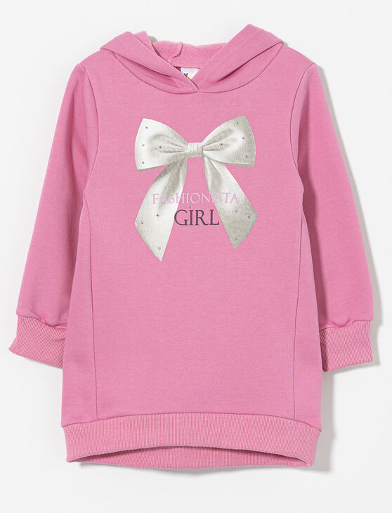 This cozy hooded tunic features an adorable print and a longer back hem for extra comfort and a playful touch.