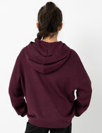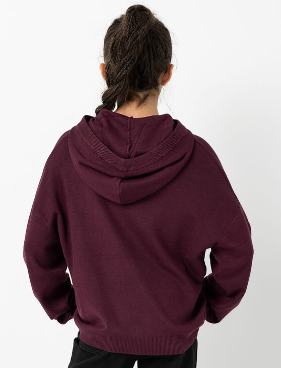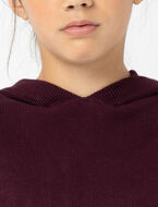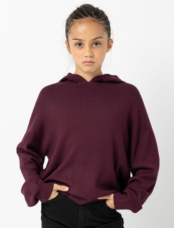 This knit hoodie sweater keeps cool days cozy while adding a trendy touch to her outfit.