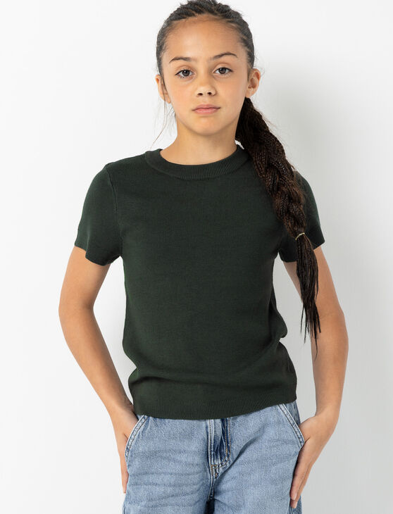 This short-sleeve knit sweater blends comfort and simplicity, making it easy for your girl to wear anytime. A versatile piece she’ll reach for again and again.