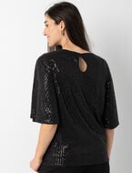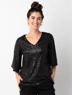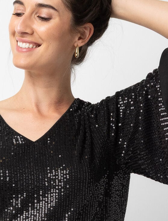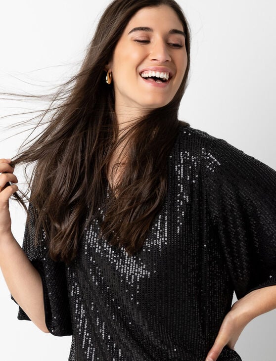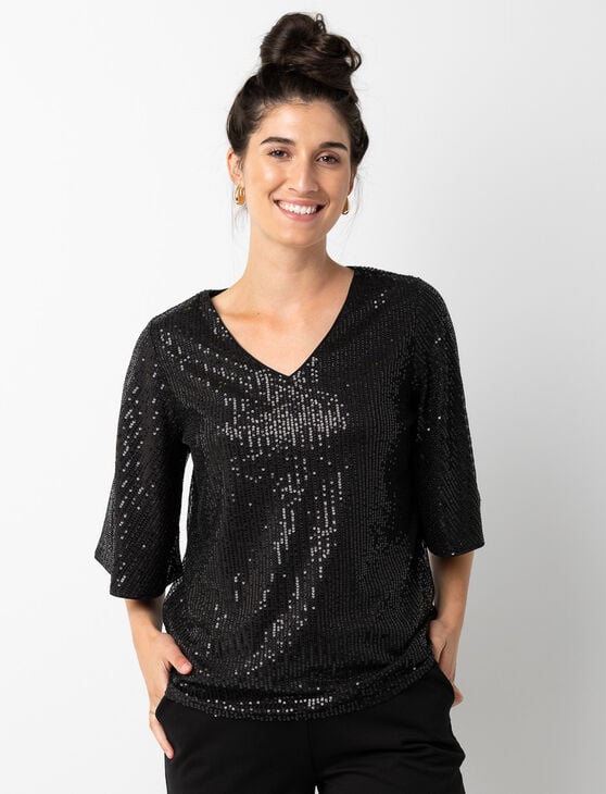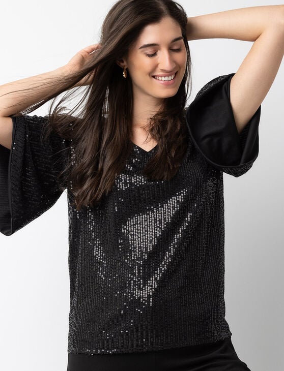Shine all night in this sequin mesh top. The V-neckline and flared 3/4 sleeves bring a touch of elegance, while the small back opening adds a chic, feminine detail.
