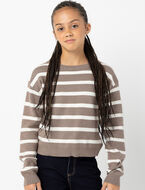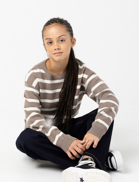 This striped knit sweater blends softness with a casual look, making it the perfect choice for your girl's everyday adventures.