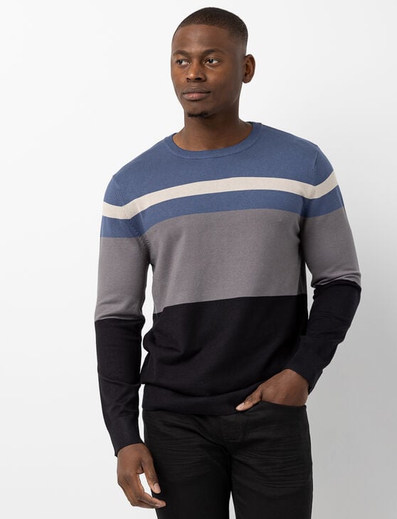 This men’s striped knit sweater combines style and comfort. Its classic crew neck and versatile fit make it a wardrobe essential for a chic everyday look.