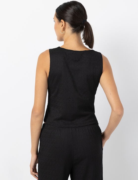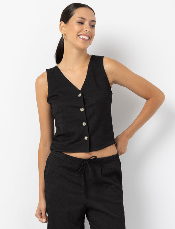 Featuring a textured fabric and pearl-like buttons, this sleeveless top is anything but basic. The cropped fit and V-neckline bring an elevated touch to your summer looks.