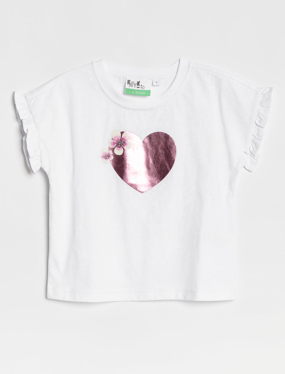 Sweet and playful, this t-shirt is perfect for little dreamers! Made from soft cotton, it features delicate ruffles and a shiny metallic heart with floral accents. Light and breathable, it’s an easy favorite for sunny days and adorable outfits.