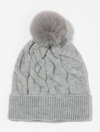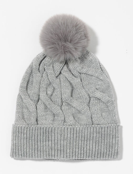 Brave the cold in style with this cable-knit beanie topped with a soft faux fur pom-pom.
