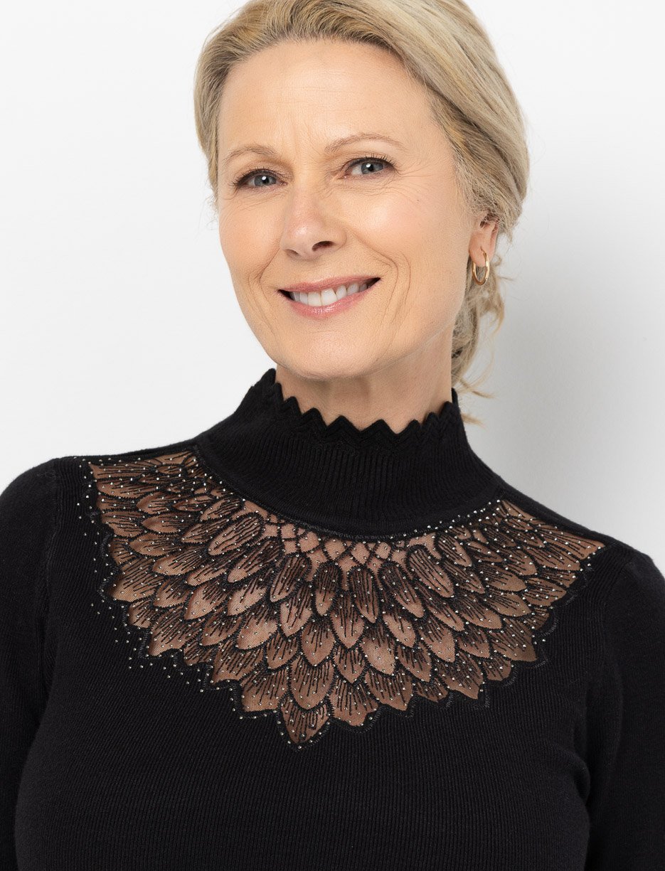 A dress with a refined mock-neck design, featuring delicate neckline details and a fitted cut that enhances the silhouette.