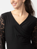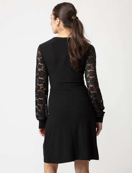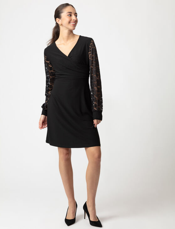 This elegant dress features delicate lace sleeves and a flattering wrap neckline, making it the perfect choice for any evening event.