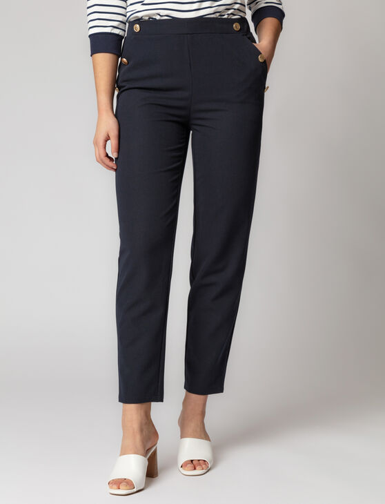 These pants with gold button details exude nautical sophistication. Designed with a pull-on waist and tapered-leg silhouette, they offer a polished yet comfortable look.