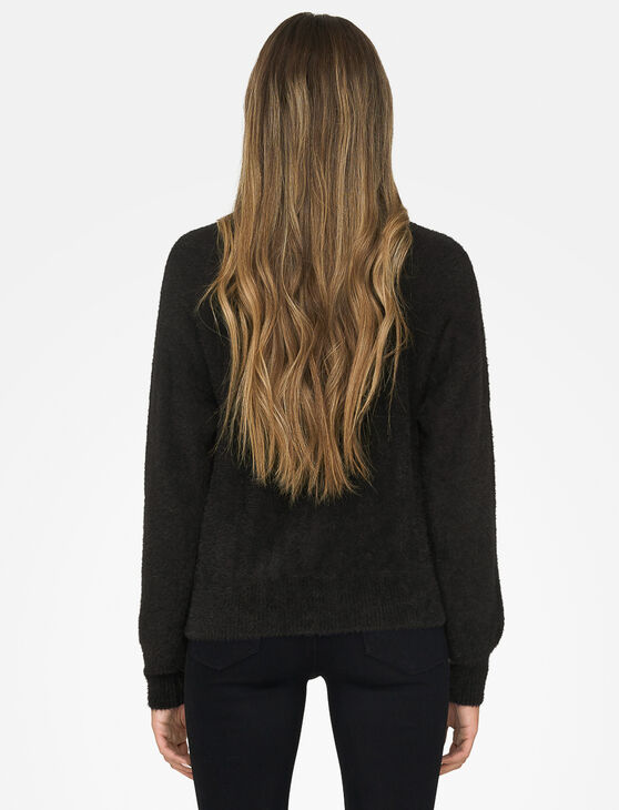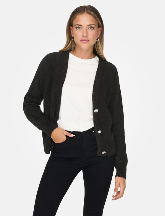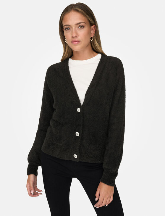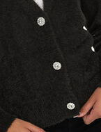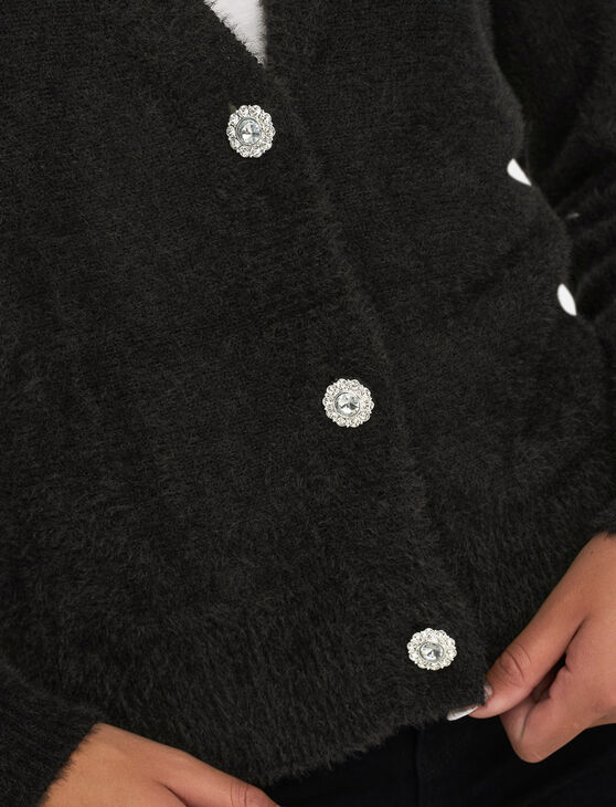 Comfort and shine meet in this soft cardigan adorned with sparkling jewel buttons. A refined piece to elevate your everyday outfits.