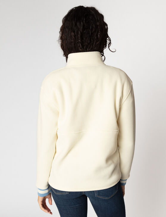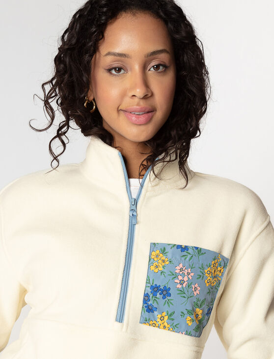 This fleece sweater combines comfort with a touch of charm. Its simple look is elevated by a lovely floral pocket. Perfect for casual outings or cozy days at home, it’s a versatile piece for every wardrobe.