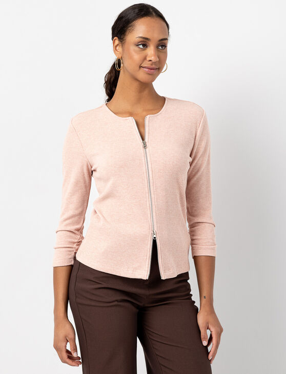 Show off a polished yet relaxed style with this zip-up top. Its flattering cut and stretchy ribbed knit let you move from desk to downtime without compromising on comfort.