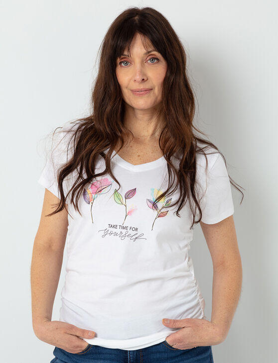 This soft and comfortable t-shirt is a wardrobe essential. Its ruched fit and versatile design make it easy to pair with jeans, shorts, or skirts. Whether for a casual day out or a relaxed evening, it brings effortless style to your look.