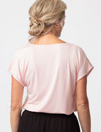 This satiny t-shirt offers a touch of sophistication with its soft sheen and relaxed fit, making it a versatile addition to any wardrobe, perfect for both day and night ensembles.