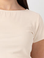 A boat neckline t-shirt with a fitted cut for a clean and minimalist look. Perfect for adding a subtle touch of elegance to everyday outfits.