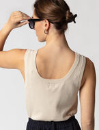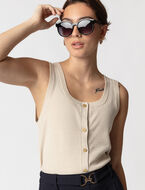 Sleek and sophisticated, this button-front tank top is perfect for warmer days. Its soft knit fabric, wide straps, and delicate gold buttons add a touch of understated elegance.