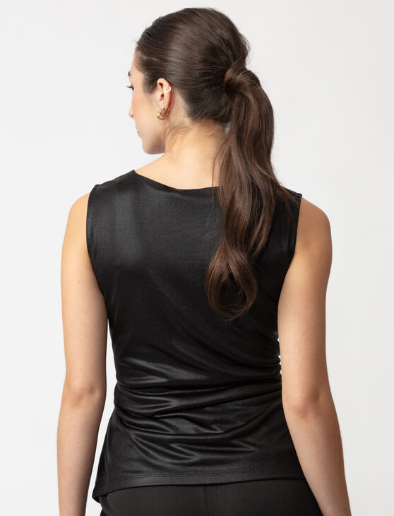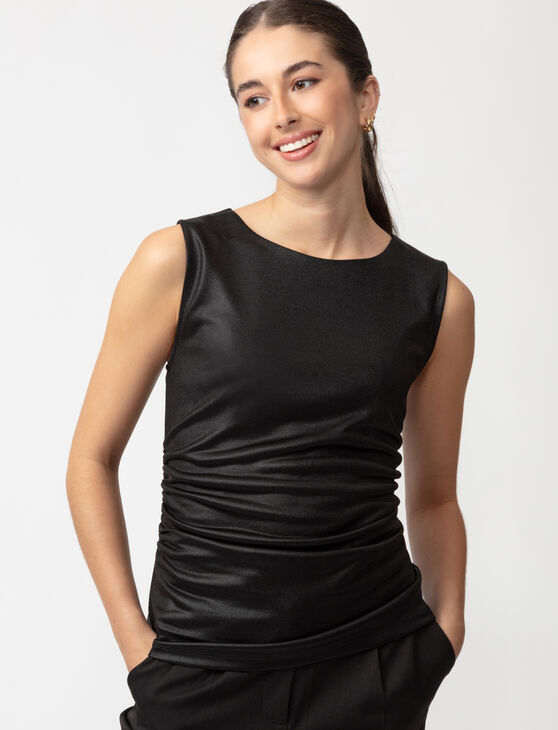 This sleek and versatile tank top is designed to elevate any wardrobe. Its smooth, slightly glossy finish and flattering ruching along the sides add a chic touch to any look.