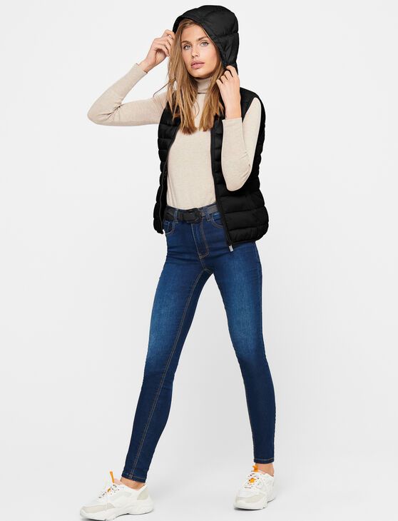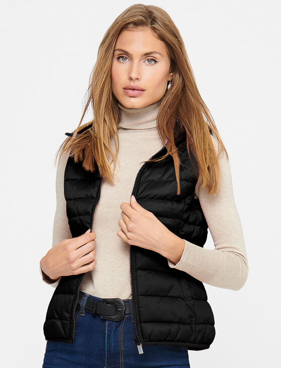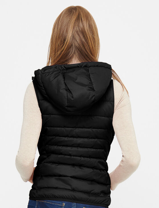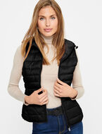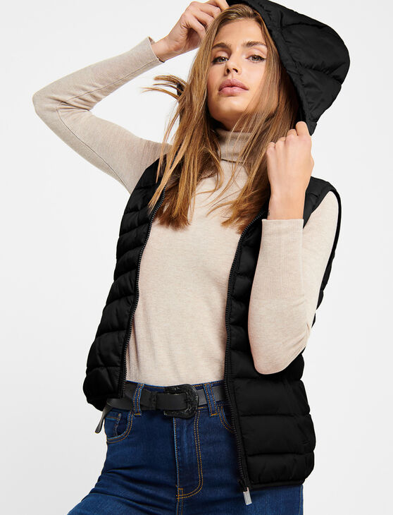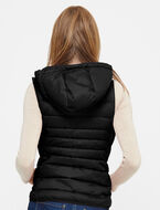 A hooded quilted vest, perfect for layering to add warmth and style to your mid-season outfits.
