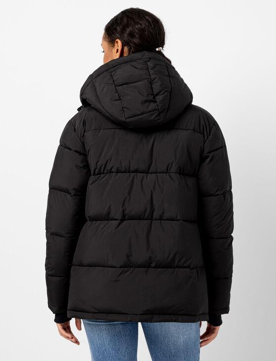 Jacket in recycled fibers, 5000 mm waterproof with comfort down to -30 °C. Detachable hood with drawstring, zip pockets, and thumbhole sleeves for added practicality and protection.