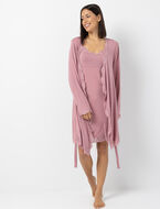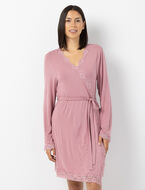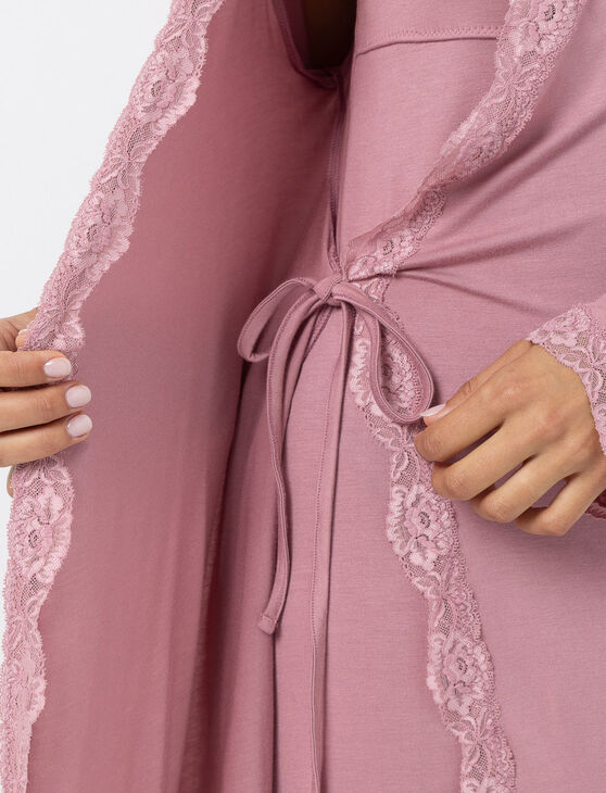 Comfort meets elegance in this soft, flowy bathrobe, adorned with delicate lace details for a refined feminine touch. Perfect for your relaxing moments at home.