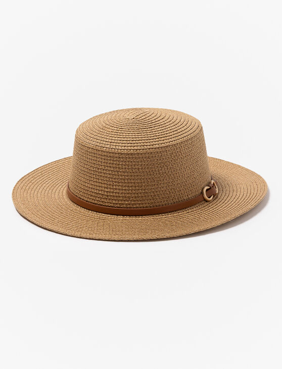 A woven straw hat featuring a leather band with a metal buckle. Light and sun-shielding, it adds an easy, elegant summer touch to warm-weather outings.