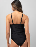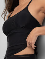 This tankini top features a flattering round neck and convertible straps for an easy fit. The solid underbust band shapes the silhouette, offering a comfortable, sun-ready style for effortless days by the water.