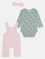 Ensemble 2 pièces composé d’un cache-couche imprimé manches longues et d’une salopette unie à bretelles. Un duo pratique et adorable pour accompagner bébé avec confort et style.