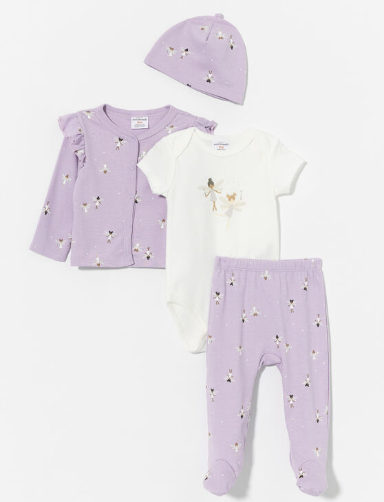 Transformez chaque matin en conte de fées avec cet ensemble 3 pièces comprenant un cache-couche doux, un pantalon orné de petits motifs de fées, un cardigan à volants et un chapeau assorti. Douceur, confort et magie réunis pour votre petit trésor.