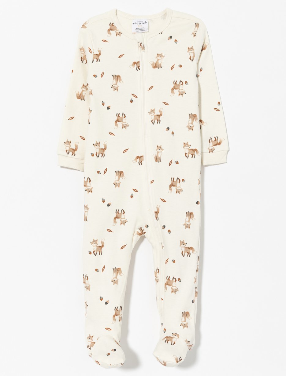 Pyjama 1 pièce à pattes en coton organique doux avec fermeture éclair pleine longueur et imprimé renards. Confortable et pratique pour les nuits paisibles de bébé.