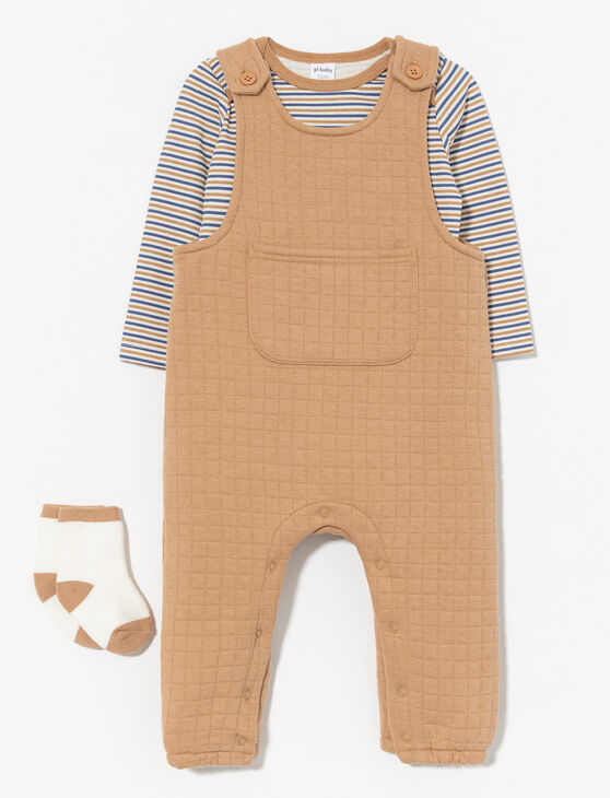 Ensemble 2 pièces comprenant une salopette matelassée avec poche avant et un haut manches longues imprimé, accompagnés de bas assortis. Idéal pour habiller bébé avec confort et douceur.