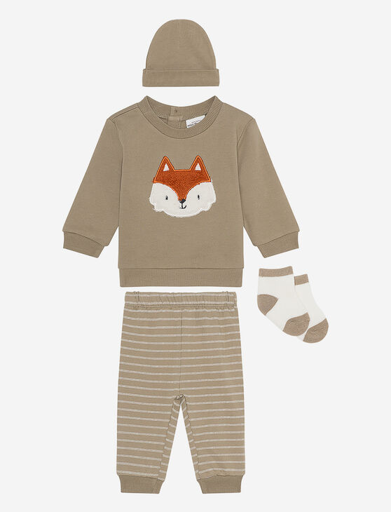 Craquez pour cet ensemble confortable qui combine douceur et style avec un appliqué en peluche brodé, un pantalon pratique et une tuque assortie pour garder bébé bien au chaud.