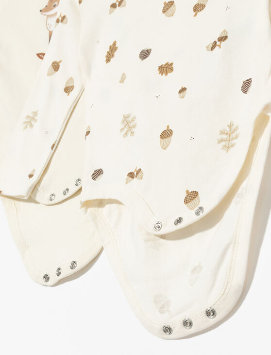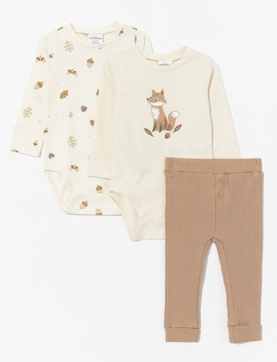 Pratique et mignon, cet ensemble 3 pièces comprend deux cache-couches à manches longues, un imprimé et un uni avec écureuil, ainsi qu’un pantalon en jersey côtelé. Le duo parfait confort et style pour bébé.