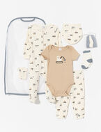 Ensemble 3 pièces avec accessoires comprenant un pyjama à glissière, un cache-couche, un pantalon imprimé et des essentiels pratiques comme bavoir, mitaines, bas et débarbouillette.