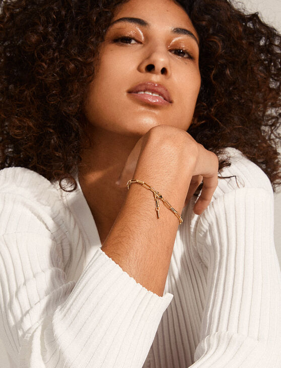 Ce bracelet à maillons rectangulaires ouverts et audacieux se distingue par son design moderne et s’associe facilement avec vos autres bijoux pour créer des looks superposés élégants et tendance.