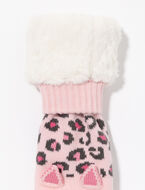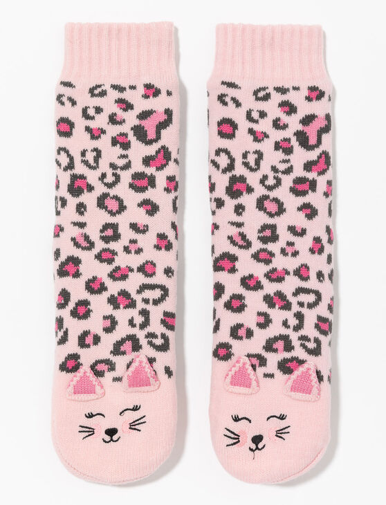Confort et fantaisie se rencontrent avec ces bas pantoufles doux au motif léopard et petit visage de chat. Parfaits pour garder vos pieds au chaud avec une touche adorable.