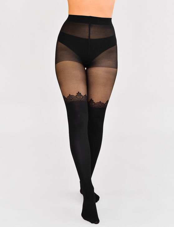 Ajoutez une touche d'élégance à votre tenue avec ces collants stylés, ornés d’un effet cuissardes et de détails en dentelle délicate. Parfaits avec des jupes ou des robes, ils allient style chic et confort quotidien.