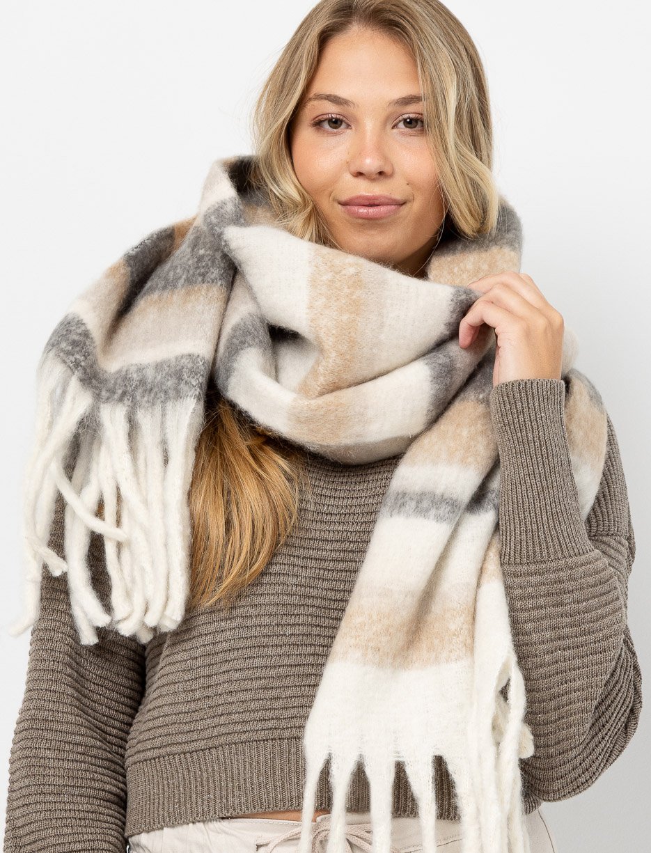 Épais et doux, ce foulard rayé complète vos tenues avec chaleur et style pour cette saison.